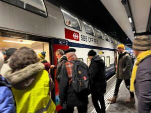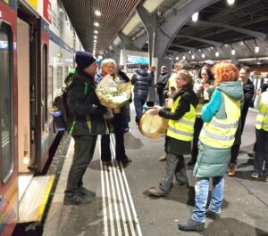 Rund 30 Personen nahmen gemeinsam den ersten Zug in Richtung HB und überraschten den Lokführer dort mit einem Blumenstrauss.